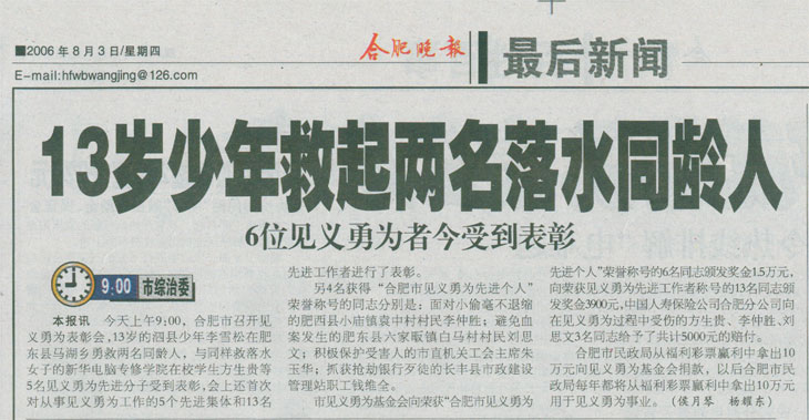 8月3日,《合肥晚报》最后新闻报道:“13岁少年救起两名落水同龄人”, 敬请关注!