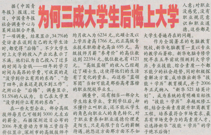当前位置:首页 > 新闻中心 > 青春新华 > 《合肥晚报》报道:为何三成大学生后悔上大学