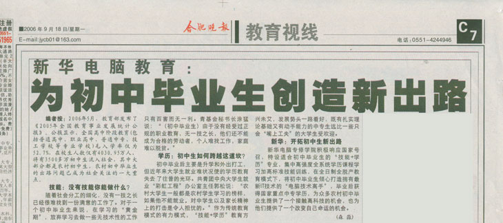 9月20日,《合肥晚报》C7版报道:“为初中毕业生能创造新出路”, 敬请关注!