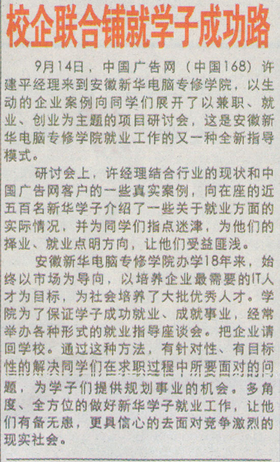 当前位置:首页 > 新闻中心 > 青春新华 > 《合肥晚报》报道:校企联合铺就学子成功路