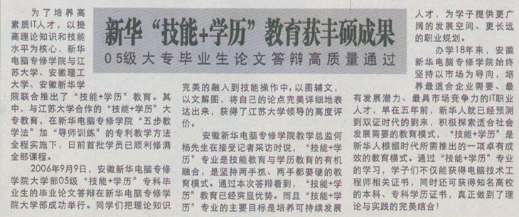 2006年9月9日,安徽新华电脑专修学院大学部05级“技能+学历”专科毕业生的毕业论文答辩在新华电脑专修学院大学部举行。学生们把理论知识完美的融入到技能操作中,毕业论文不仅展示了其深厚的理论知识结构水平,同时,还展现了他们通过对理论知识的灵活运用而制作出来的效果图,以图辅文,以文解图。同学们的创新意识和动手能力获得了江苏大学领导的高度评价。