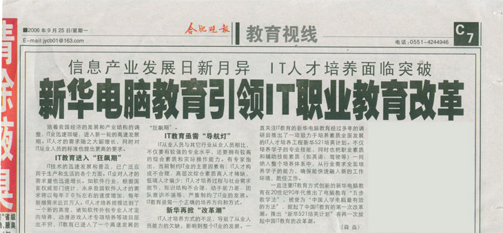 9月25日,《合肥晚报》C7版报道:“新华电脑教育引领IT职业教育改革”, 敬请关注!