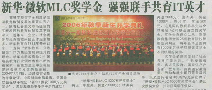 10月2日,《合肥晚报》C7版报道:“新华•微软MLC奖学金 强强联手共育IT英才”, 敬请关注!