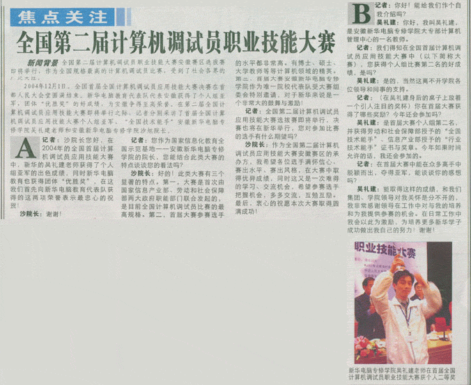 2004年12月1日,全国首届全国计算机调试员应用技能大赛决赛在首都北京人民大会堂圆满结束。新华电脑教育代表队代表安徽获得了个人组亚军,团体“优胜奖”的好成绩,为安徽争得至高荣誉。在第二届全国计算机调试员应用技能大赛即将举行之际,记者分别采访了首届全国计算机调试员应用技能大赛个人组亚军、“全国技术能手”安徽新华电脑专修学院吴礼建老师和安徽新华电脑专修学院沙旭院长,以下采访记录:
