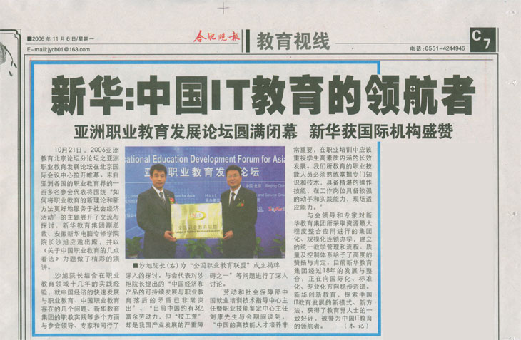 11月6日,《合肥晚报》C7版报道:“新华:中国IT教育的领航者”, 敬请关注!