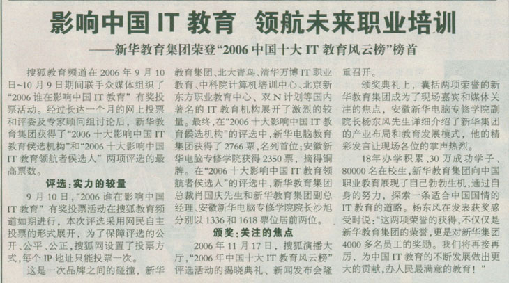 当前位置:首页 > 新闻中心 > 青春新华 > 《安徽商报》报道:影响中国IT教育 领航未来职业培训