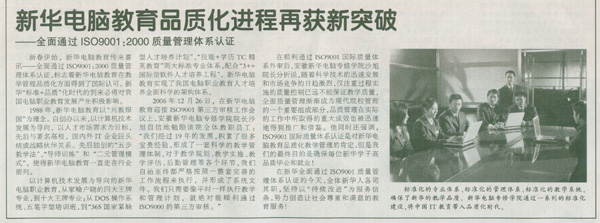 3月5日,《安徽商报》报道:“新华电脑教育品质化进程再获新突破—全面通过IS09001:2000质量管理体系认证”,敬请关注!
