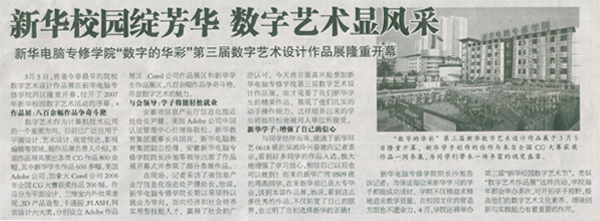 3月7日,《安徽商报》报道:“新华校园绽芳华 数字艺术显风采—新华电脑专修学院‘数字的华彩’第三届数字艺术设计作品展隆重开幕”,敬请关注!