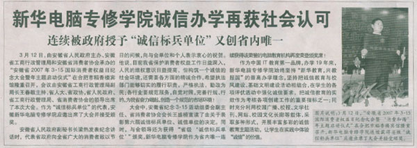 3月15日,《合肥晚报》报道:“新华电脑专修学院诚信办学再获社会认可—连续被政府授予‘诚信标兵单位’又创省内唯一”,敬请关注!