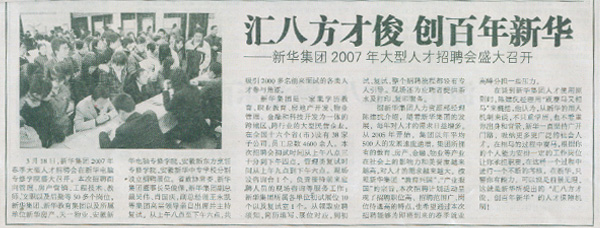 3月19日,《安徽市场报》报道:“汇八方才俊 创百年新华—新华集团2007年大型人才招聘会盛大召开”,敬请关注!