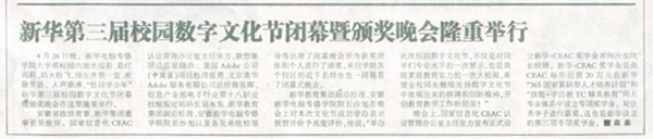 4月30日,《安徽市场报》报道:“新华第三届校园数字文化节闭幕暨颁奖晚会隆重举行”,敬请关注!