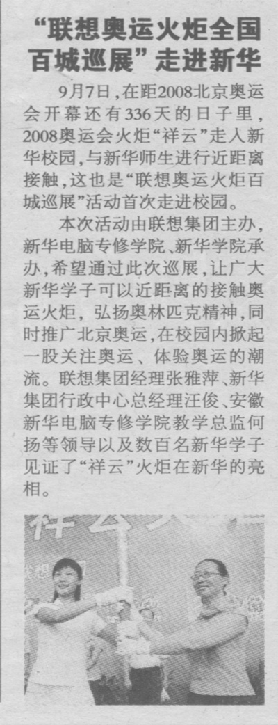 9月10日,《安徽市场报》报道:“‘联想奥运火炬全国百城巡展走进新华’”,敬请关注!