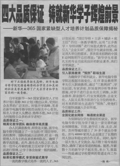 9月13日,《合肥晚报》报道:“四大品质保证 铸就新华学子辉煌前景——新华-365国家紧缺型人才培养计划品质保障揭秘”,敬请关注!