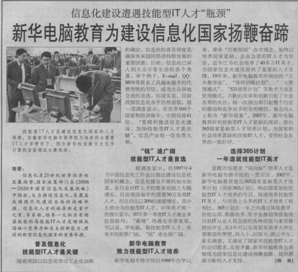 9月25日,《中国青年报》报道:“信息化建设遭遇技能型IT人才‘瓶颈’——新华电脑教育为建设信息化国家扬鞭奋蹄”!