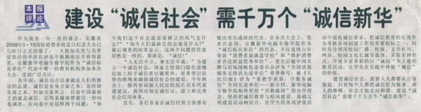 > 《安徽市场报》报道:建设“诚信社会”需千万个“诚信新华”
