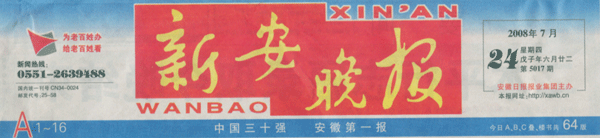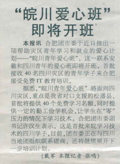 《新安晚报》报头 《新安晚报》报道新闻页面截图安徽新华电脑专修学院与共青团合肥市委员会启动“新华·皖川青年爱心班”