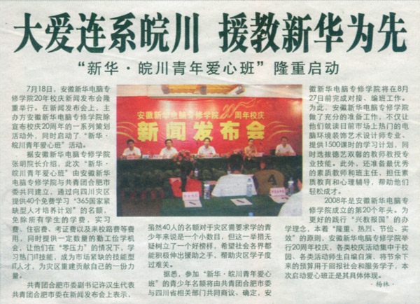 安徽市场报报道:新华20年回报社会 爱心专业震撼推出