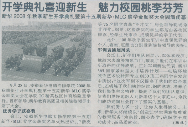 开学典礼喜迎新生 魅力校园桃李芬芳——新华2008年秋季新生开学典礼暨第十五期新华·MLC奖学金颁奖大会圆满闭幕