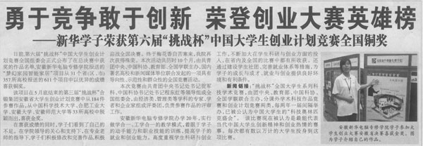 10月22日,《合肥晚报》报道:“勇于竞争敢于创新 荣登创业大赛英雄榜——新华学子荣获第六届‘挑战杯’中国大学生创业计划竞赛全国铜奖”,敬请关注!