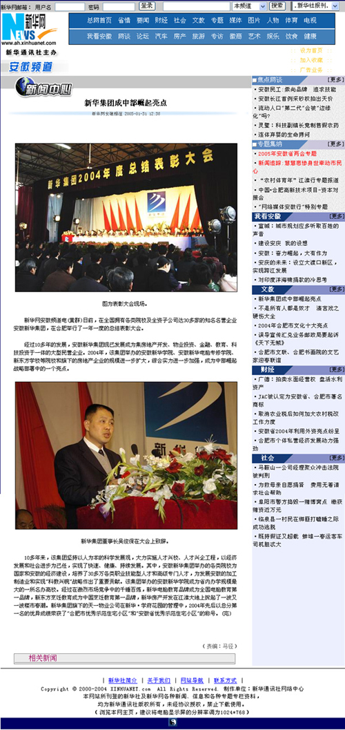 日前,在全国拥有各类院校及全资子公司达30多家的知名民营企业安徽新华集团,在合肥举行了一年一度的总结表彰大会。经过10多年的发展,安徽新华集团现已发展成为集房地产开发、物业投资、金融、教育、科技投资于一体的大型民营企业。2004年,集团举办的安徽新华学院、安徽新华电脑专修学院、新东方学校等院校和旗下的房地产企业的规模进一步扩大,综合实力进一步加强,成为中部崛起战略部署中的一个亮点。