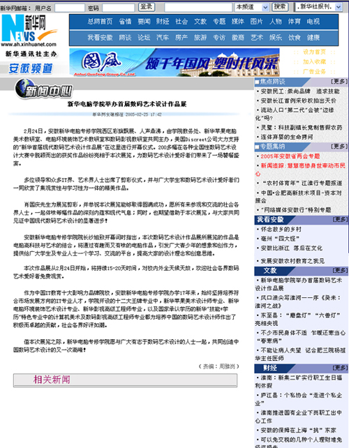 2005年2月24日,安徽新华电脑专修学院西区彩旗飘展、人声鼎沸,由学院教务处、新华苹果电脑美术教研室、电脑环境装饰艺术教研室和数码影视教研室共同主办,美国Discreet公司大力支持的"新华首届现代数码艺术设计作品展"在这里进行开幕仪式。200多幅在各种全国性数码艺术设计大赛中脱颖而出的获奖作品纷纷亮相于本次展览,为数码艺术设计爱好者们带来了一场饕餐盛宴。