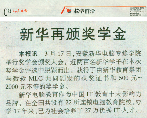 3月25日,《新安晚报》报道了“新华再颁奖学金”的消息,并做了详细报道,敬请关注!