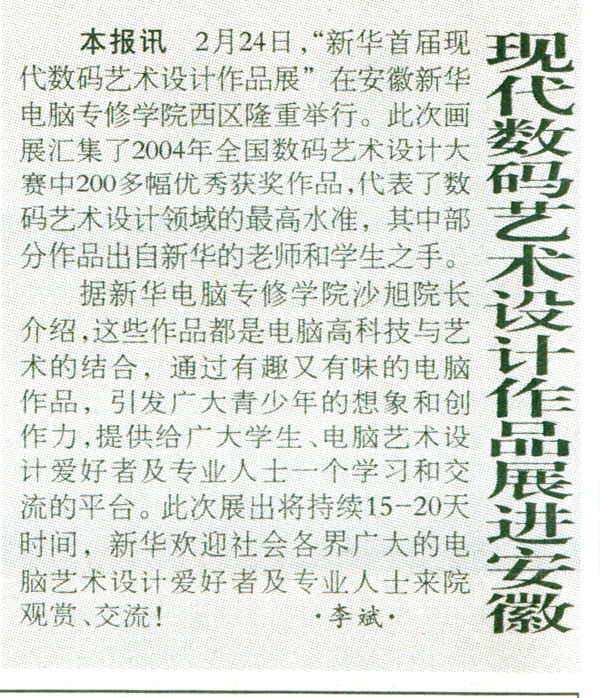 2005年2月24日,安徽新华电脑专修学院西区彩旗飘展、人声鼎沸,由学院教务处、新华苹果电脑美术教研室、电脑环境装饰艺术教研室和数码影视教研室共同主办,美国Discreet公司大力支持的"新华首届现代数码艺术设计作品展"在这里进行开幕仪式。200多幅在各种全国性数码艺术设计大赛中脱颖而出的获奖作品纷纷亮相于本次展览,为数码艺术设计爱好者们带来了一场饕餐盛宴。