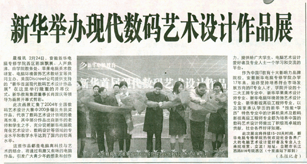 2005年2月24日,安徽新华电脑专修学院西区彩旗飘展、人声鼎沸,由学院教务处、新华苹果电脑美术教研室、电脑环境装饰艺术教研室和数码影视教研室共同主办,美国Discreet公司大力支持的"新华首届现代数码艺术设计作品展"在这里进行开幕仪式。200多幅在各种全国性数码艺术设计大赛中脱颖而出的获奖作品纷纷亮相于本次展览,为数码艺术设计爱好者们带来了一场饕餐盛宴。