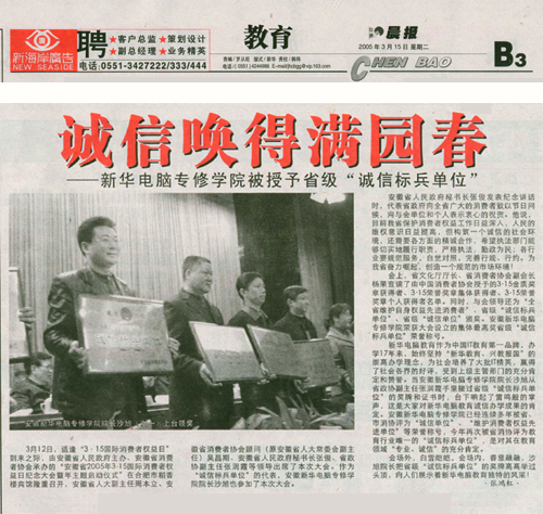 3月15日,《江淮晨报》教育版(B3)报道“诚信唤得满园春——新华电脑专修学院被授予省级‘诚信标兵单位’的消息,并做了详细报道,敬请关注!