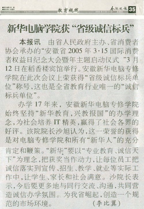 由安徽省人民政府主办、安徽省消费者协会承办的“安徽省2005年3.15国际消费者权益日纪念大会暨年主题启动仪式”在合肥市稻香楼宾馆隆重举行。安徽新华电脑专修学院在此会议上荣获得“省级诚信标兵单位”称号,这也是全省教育行业唯一的“诚信标兵单位”。