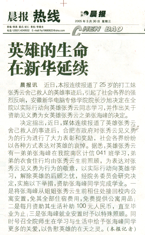 3月30日,《江淮晨报》报道“英雄的生命在新华延续”的消息并做了详细报道,敬请关注!