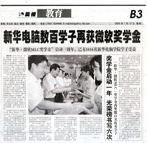 7月12日,《江淮晨报》“教育”版报道“新华电脑数百学子再获微软奖学金”,并做了详细介绍,敬请关注!