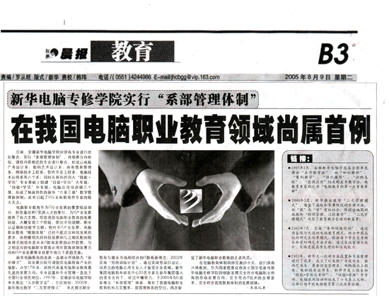 8月9日,《江淮晨报》报道安徽新华电脑学院实行“系部管理体制”的新闻,敬请关注!