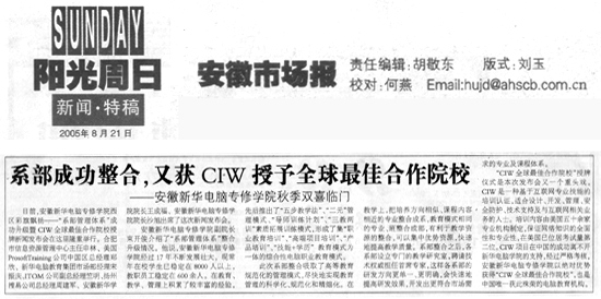 8月21日,《安徽市场报》报道了“系部成功整合,又获CIW授予全球最佳合作院校——安徽新华电脑专修学院双喜临门”的新闻,并做了详细报道,敬请关注!