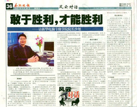 8月24日,《合肥晚报》记者采访了新华电脑专修学院院长沙旭,沙旭院长就“英雄梦”、“成功与情商”、“职业教育谈”三个方面畅谈了对人生的感悟与认识,以及对电脑职业教育的现状分析和今后的发展趋势。8月26日,《合肥晚报》“风云对话”版对此做了全面的报道!