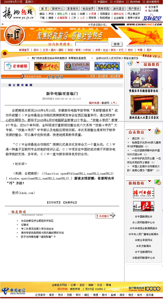 8月18日,“扬州热线”新闻版报道了“新华电脑双喜临门”的新闻,并做了详细报道,敬请关注!