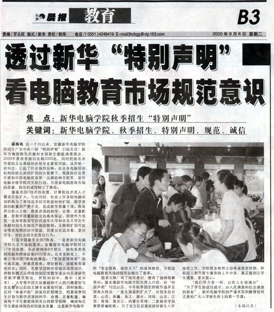 9月6日,《江淮晨报》教育版报道“透过新华“特别声明”看电脑教育市场规范意识”的新闻,并做了详细报道,敬请关注!