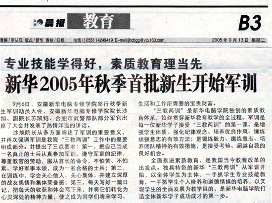 9月13日,《江淮晨报》报道“新华电脑学院05年秋季首批新生开始接受军训”的新闻,并做了详细报道,敬请关注!