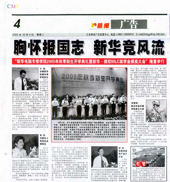 10月4日,《江淮晨报》报道“胸怀报国志 新华竞风流——‘新华电脑专修学院2005年秋季新生开学典礼暨新华-微软MLC奖学金第七期颁奖大会’在安徽大剧院隆重举行”的新闻,并做了详细报道,敬请关注!