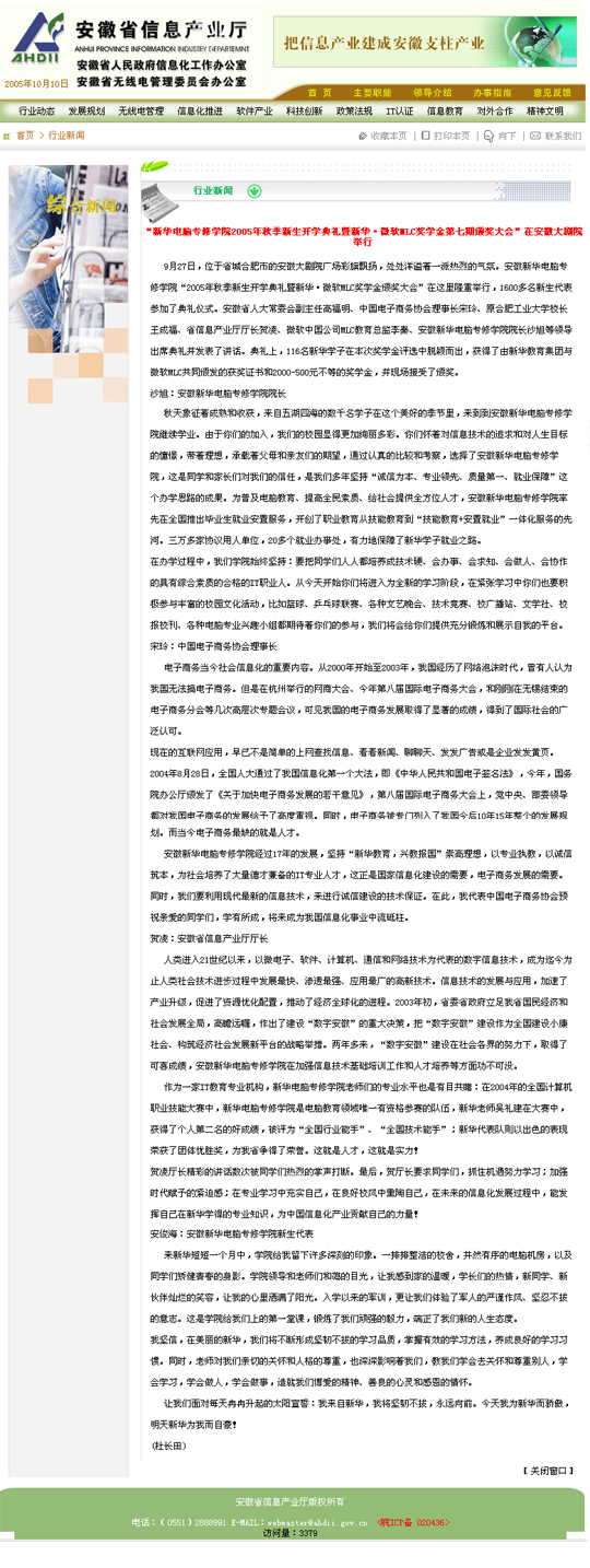 10月8日,省信息产业厅网报道“‘新华电脑专修学院2005年秋季新生开学典礼暨新华-微软MLC奖学金第七期颁奖大会’在安徽大剧院隆重举行”的新闻,并做了详细报道,敬请关注!
