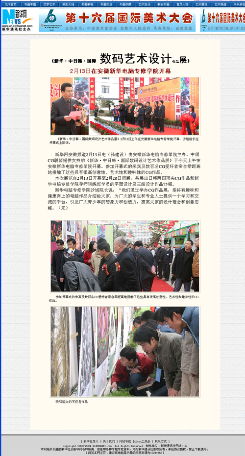 2月13日下午,新华社新华网安徽频道艺术版报道“《新华·中日韩·国际 数码艺术设计作品展》2月13日在安徽新华电脑专修学院开幕”的新闻,并做了详细报道,敬请关注!