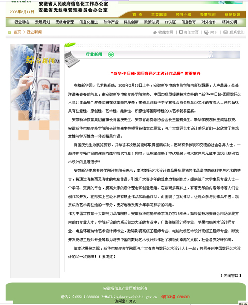 2月13日下午,《省信息产业厅网》“行业新闻”栏目报道“新华·中日韩·国际 数码艺术设计作品展隆重举办”的新闻,并做了详细报道,敬请关注!