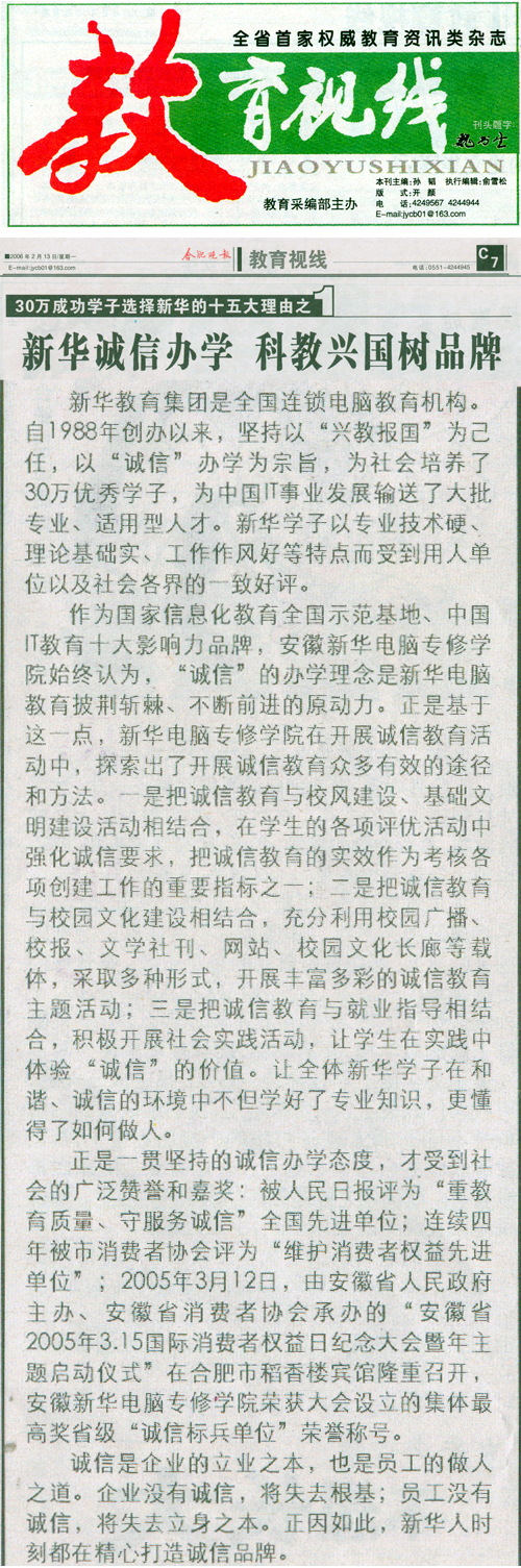 2月13日,《合肥晚报》教育视线版报道“30万成功学子选择新华的十五大理由之1——新华诚信办学 科教兴国树品牌”的新闻,并做了详细报道,敬请关注!