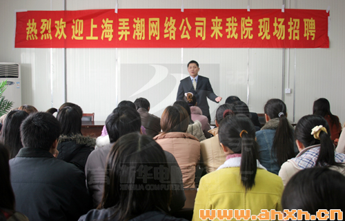 2月28日下午,省城合肥上空白雪飘飘,上海弄潮网络公司徐副总裁冒着严寒飞雪,来到位于合肥市水阳江路1号的安徽新华电脑专修学院南区,与新华电脑应用高级全能专业、CEAC国家信息化工程师专业、新华电子商务高级应用工程师专业的百余名学子进行了互动,拟招一批新员工来补充公司的新鲜血液。