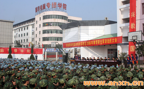 阳春三月,花香拂面,安徽新华电脑专修学院里生机盎然,3月6日,院西区06年春季新生军训动员大会胜利召开,安徽预备役高炮团的教官们带领着安徽新华电脑专修学院06春季新生,身着绿色军衣,活跃在学院广场内,开始体验军训的酸甜苦辣。