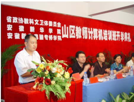 2005年,由政协安徽省委教科文卫体委员会主办,安徽新华电脑专修学院承办的贫困地区中小学教师计算机课程免费培训活动在合肥举行。此次培训前,省政协厅级领导和该校代表冒酷暑、战高温,不远千里深入金寨、霍山、岳西三县对信息化培训需求进行调研。通过实地考察,了解到基层教师迫切需要学习的计算机知识。根据具体情况而制定了完善的培训课程。为了圆满完成此次任务,安徽新华电脑学院精心挑选了数名优秀的培训讲师,同时为学员免费提供了近万元的计算机图书,旨在使参训的贫困地区中小学教师能独立承担当地的信息化再教育工作。同时也希望参加此次培训的老师在学成后以传带帮的方式,让家乡的其他教师共享现代化的计算机知识。