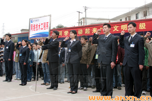新华学子宣誓:我们是新华电脑专修学院南区,我们要虚心进取,创优异成绩;迎难而上,跨崭新台阶!