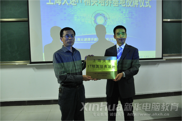 2010年9月27日,安徽新华电脑专修学院与上海火速网络科技有限公司携手创办的“IT精英培养基地”授牌仪式在学院职教城新校区隆重举行。上海火速网络科技有限公司王宏征总监、牟敏经理以及学院教学、就业等部门负责人,新生代表等出席了授牌仪式。