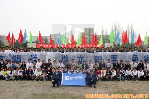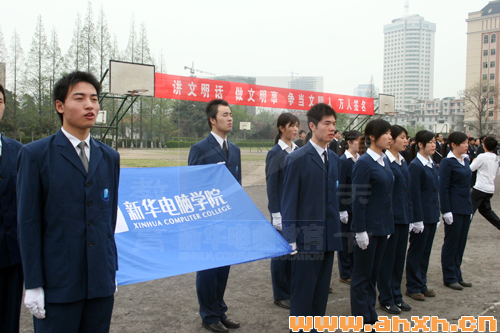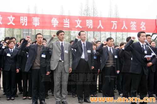 这是个春意盎然的季节,这是个万物复苏的季节,在这样一个绿荫成林的季节里,安徽新华电脑专修学院大专部的全体师生在广阔的操场上庄严宣誓:我是一名新华人,为了共建我们的文明校园,我宣誓,讲文明话,做文明事,遵守文明校园五要十不准,争做文明人。每个人的脸上都挂着坚定而执着的表情,他们的声音在合肥的高空中回荡……
