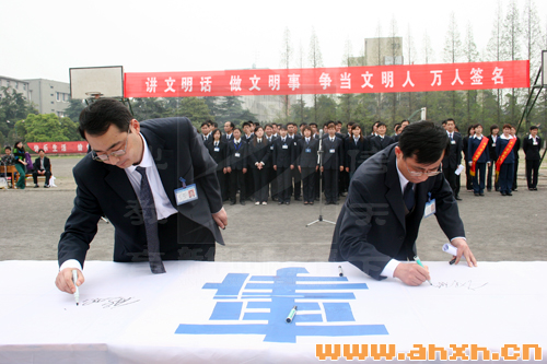 继本次签名仪式后,安徽新华电脑专修学院还将通过校会、班会、网站、校报、广播、板报等形式和渠道对全院师生进行更深入的宣传和教育,层层发动,提高认识,落实行动,借第二届新华数字艺术节之东风,继续开展创建“文明寝室”、“文明班组”和“文明校园”的评比活动。